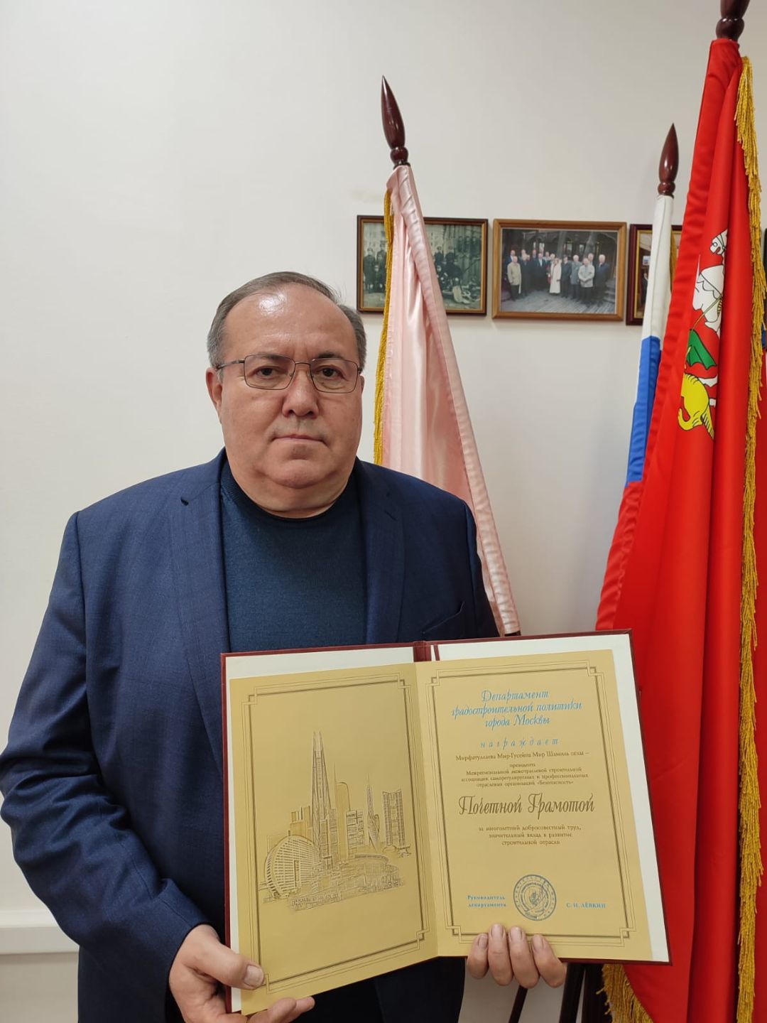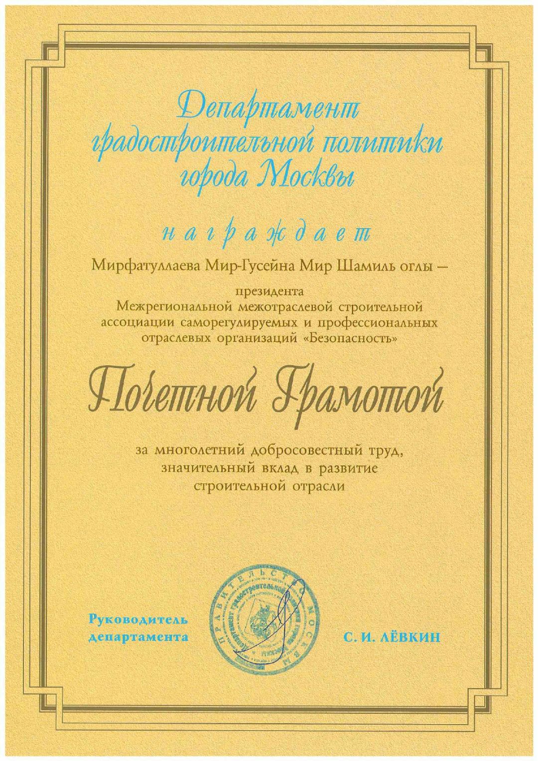 Президент Ассоциации СРО «МОАБ» Мирфатуллаев Мир-Гусейн Мир Шамиль оглы награжден почетной грамотой Департамента градостроительной политики города Москвы за многолетний добросовестный труд и значительный вклад в развитие строительной отрасли