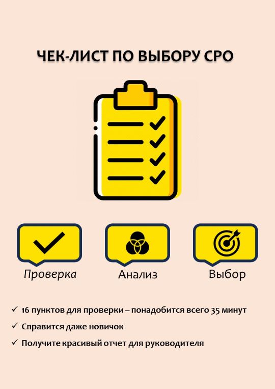 Наш чек-лист – это бесплатный сервис, который мы предоставляем для строительных и проектных компаний. Он позволяет быстро и просто проанализировать различные аспекты практически любой СРО и выбрать наиболее подходящую по всем параметрам.